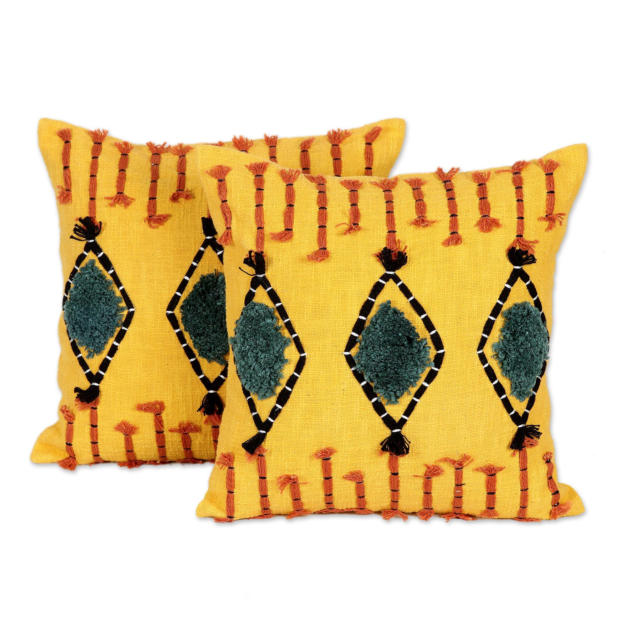 2 Geometric Cotton Cushion Covers with Tufted Embroidery, 'Sunlight Bliss'