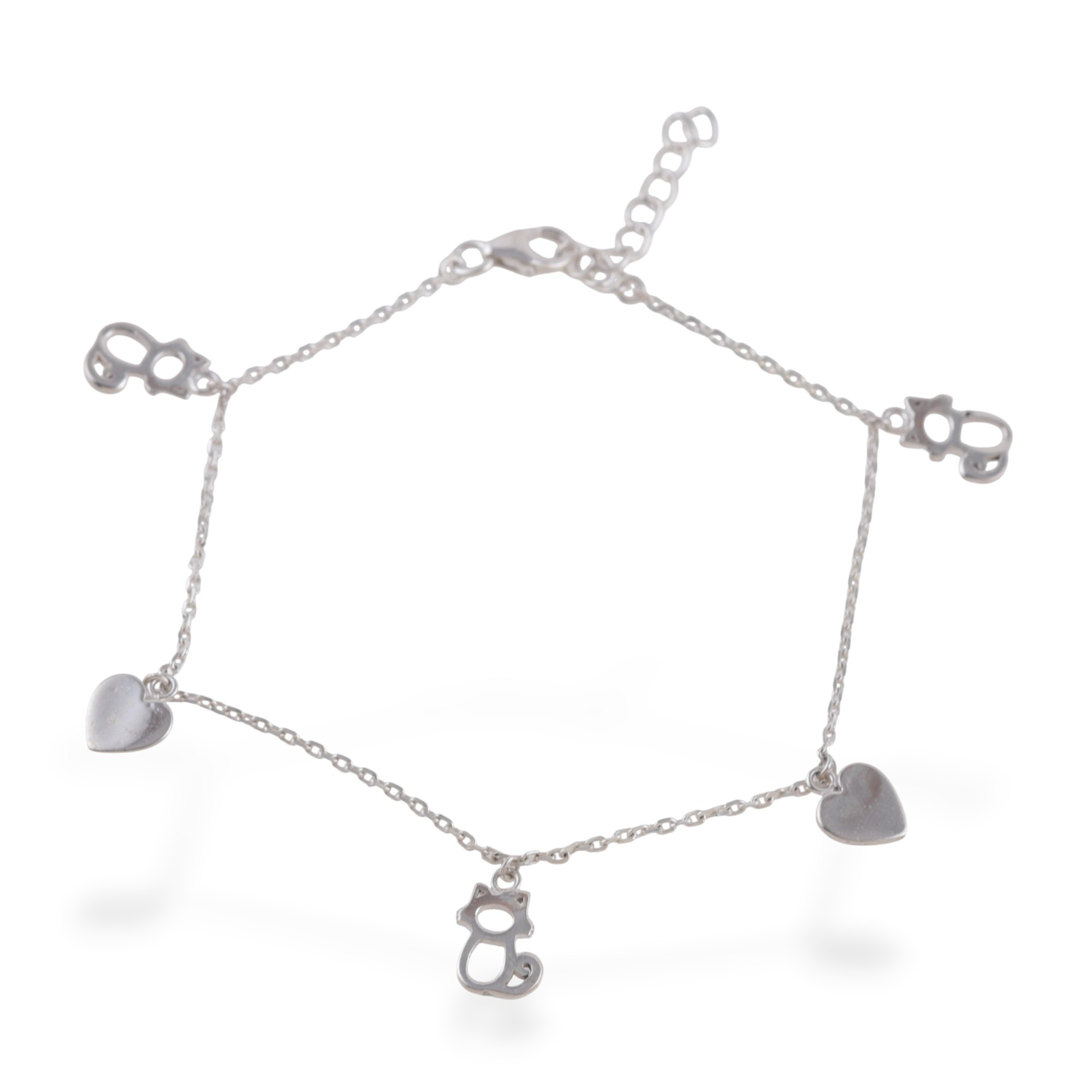 Adjustable Silver Bracelet with Heart and Hollow Cat Charms, 'Kitty Love'