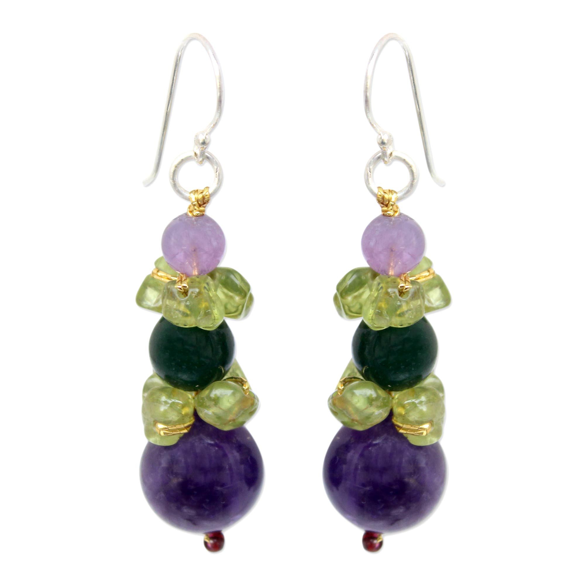 Amethyst and peridot beaded earrings, 'Thai Harmony' - Amethyst and Quartz Dangle Earrings