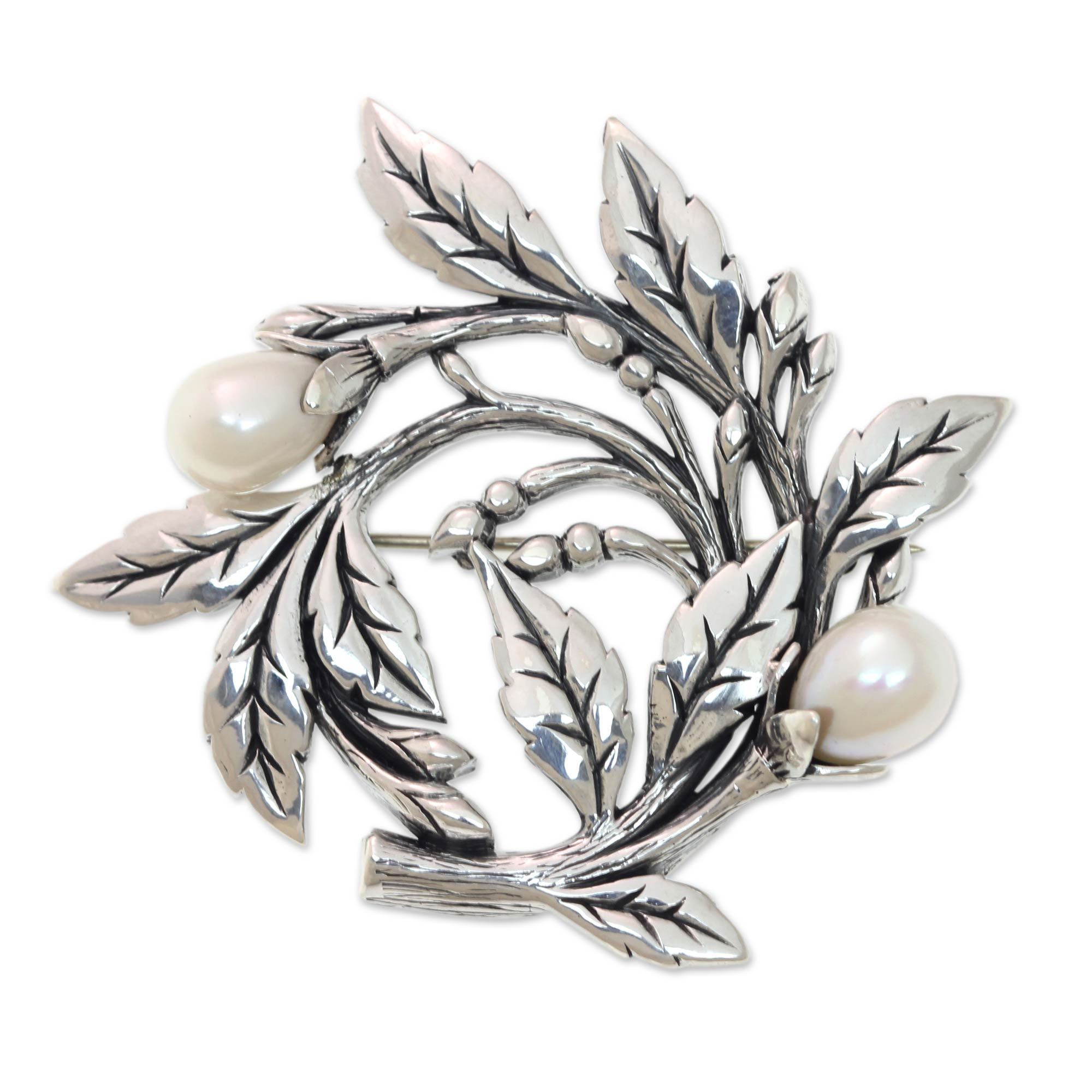 This elegant brooch from Balinese artisan Wayan Asmana features curving branches carefully rendered in sterling silver. Oxidized areas emphasize the meticulous detail given to every leaf and bud. White cultured pearls, like budding cotton bolls, grace the original design.