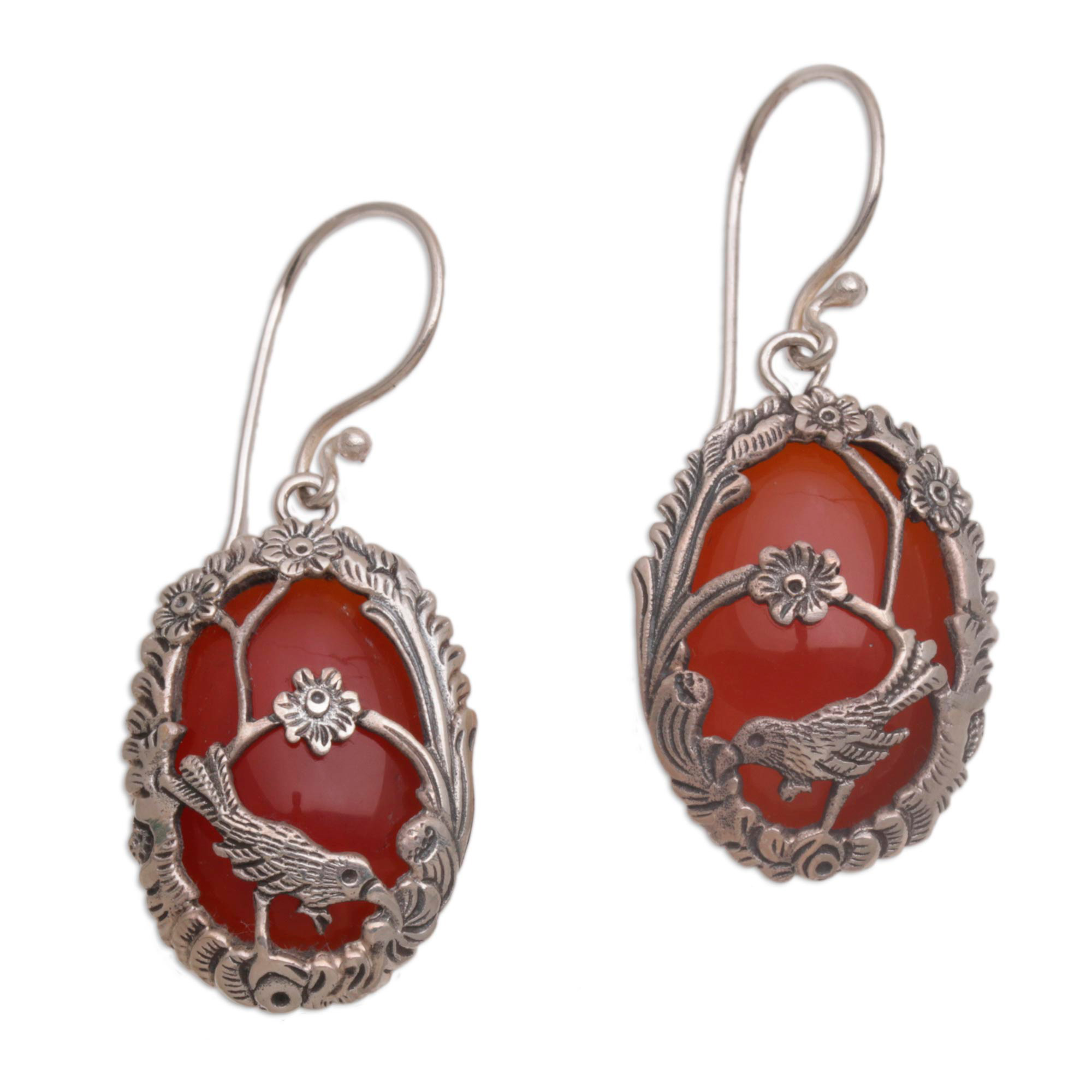 Carnelian and 925 Silver Bird Dangle Earrings from Bali, 'Avian Curiosity'