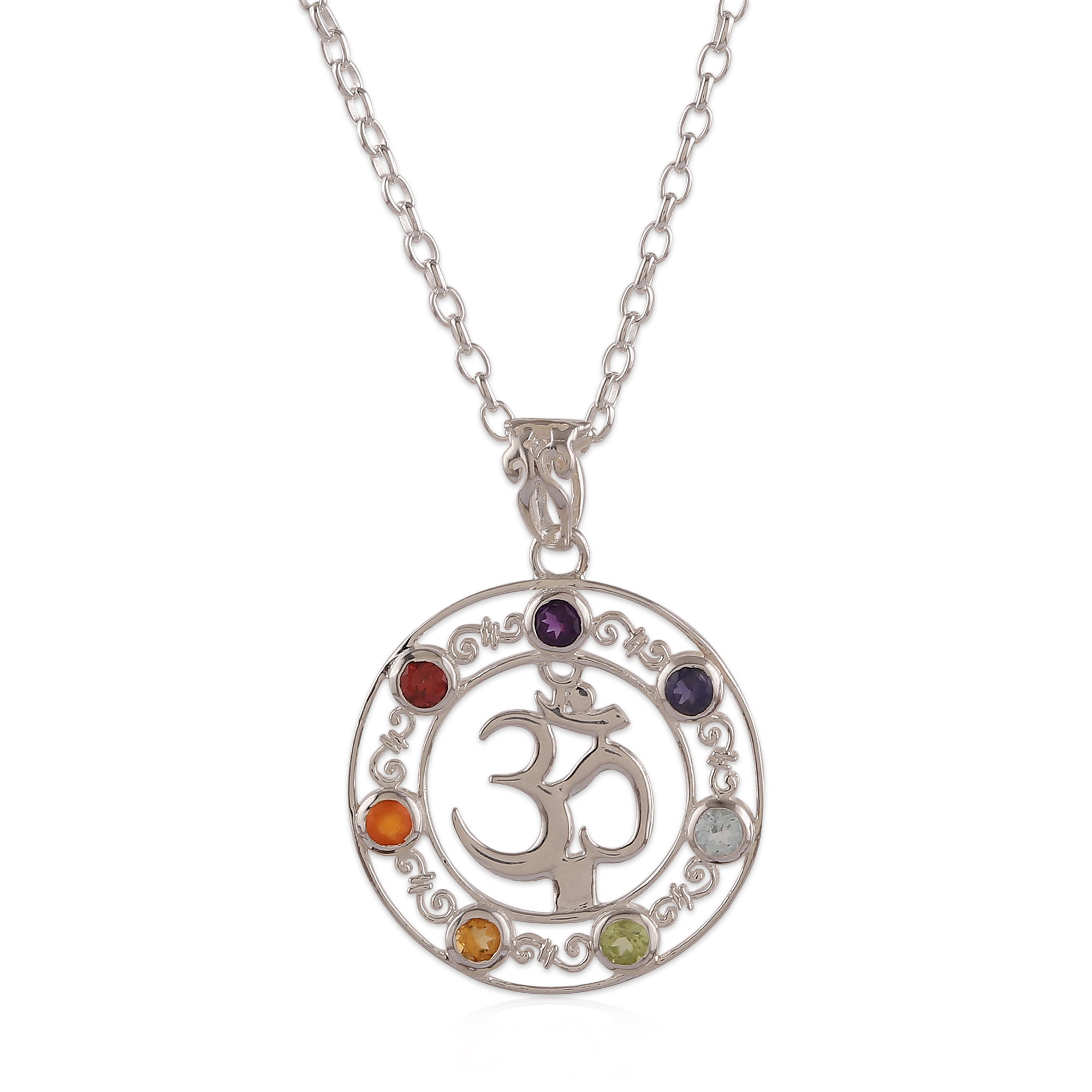 A lesson of spiritual harmony and enlightenment lives inside each of the jewels that decorate this sterling silver pendant necklace by India's best jewelers. Alok Jain presents this exquisite piece, inspired by the Om mantra and the Chakra doctrine. Embraced by high-polished details, the jewels include a garnet as the root chakra, a carnelian as the sacral chakra, a citrine as the solar plexus chakra, a peridot as the heart chakra, an iolite as the throat chakra, a blue topaz as the third-eye chakra, and an amethyst as the crown chakra.