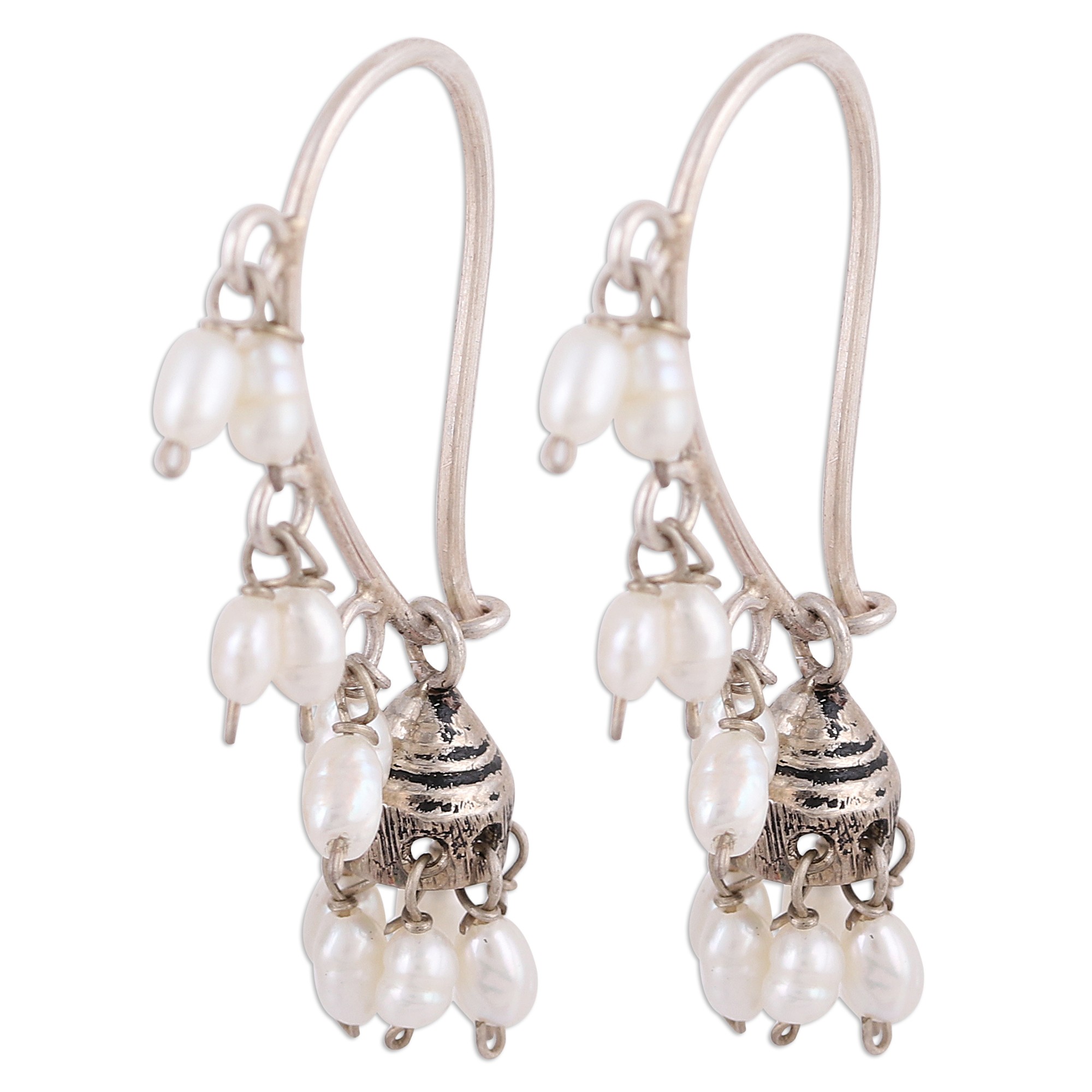 Shimmering cultured freshwater oval pearls dance elegantly above and below a charming bell in these gorgeous earrings. Designed by Alok Jain, this eye-catching design is known as jhumki, which means "hanging earrings" in Hindi. Each earring is hand crafted from sterling silver, and features a kidney hook.