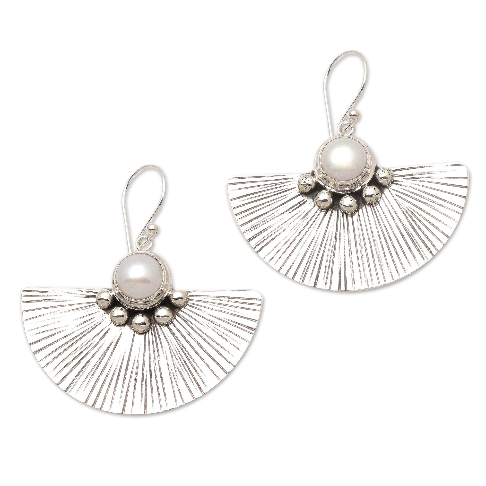 Cultured White Pearl and Sterling Silver Earrings, 'Celuk Fan'