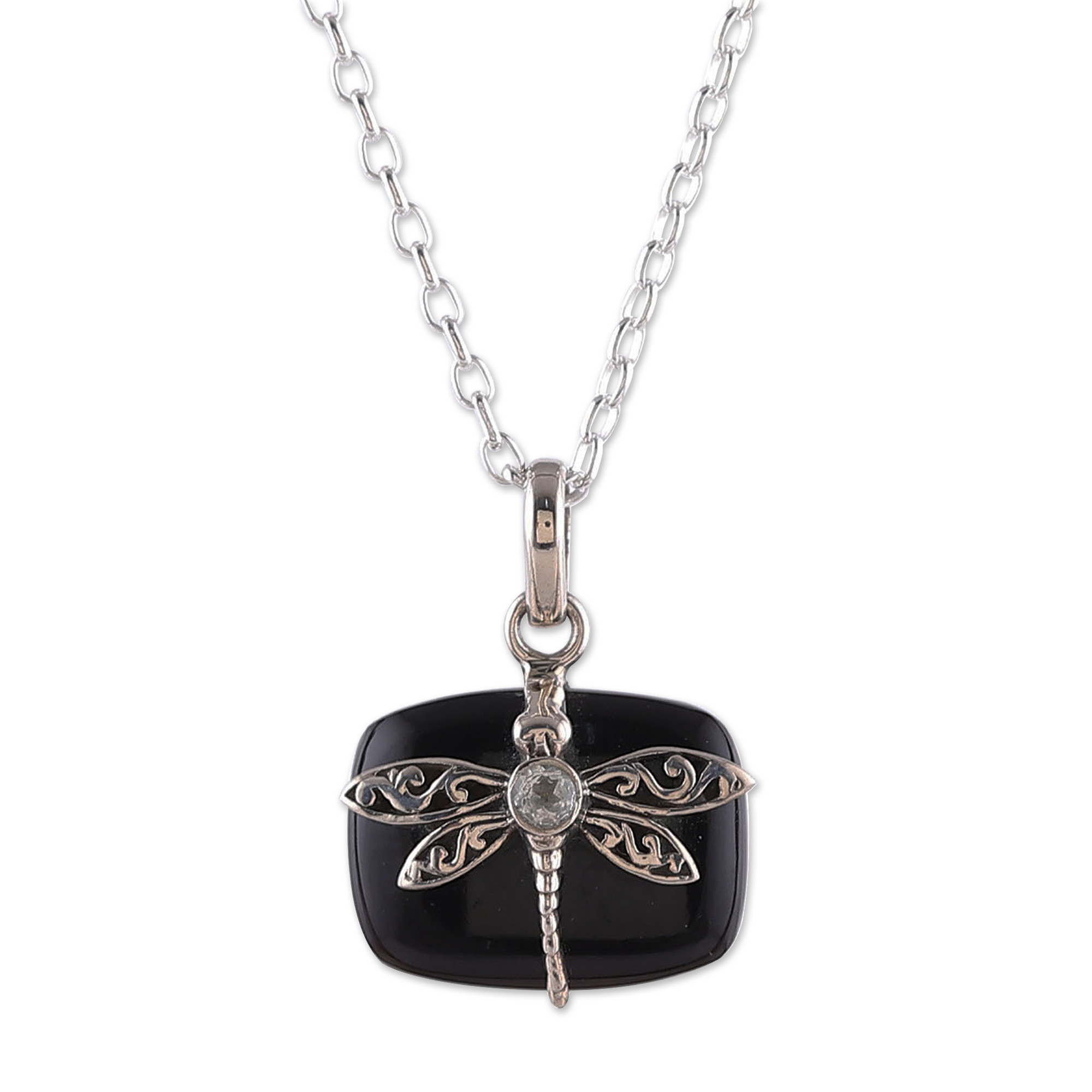 Dragonfly-Themed Black Onyx Pendant Necklace with Quartz Gem, 'Mysterious Flutter'