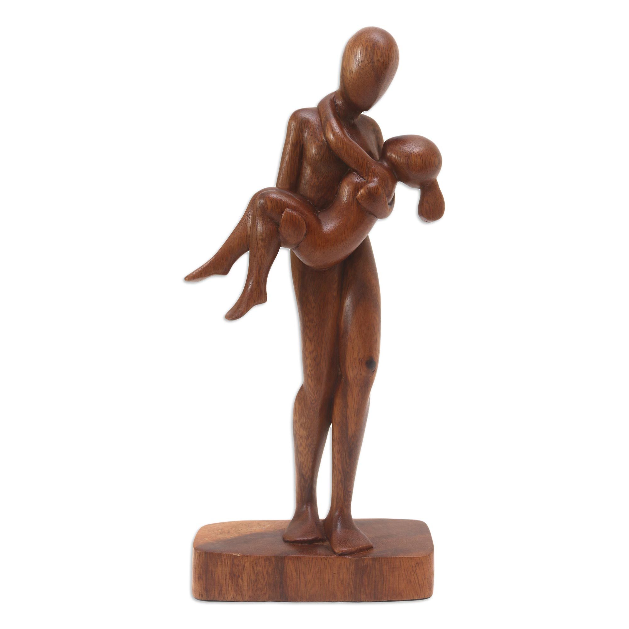 A small child looks toward her mother for protection, while the mother looks down with love. Presented by Eka in Bali, the sculpture is hand carved from local suar wood before being polished so the natural grain shows through the lustrous finish.