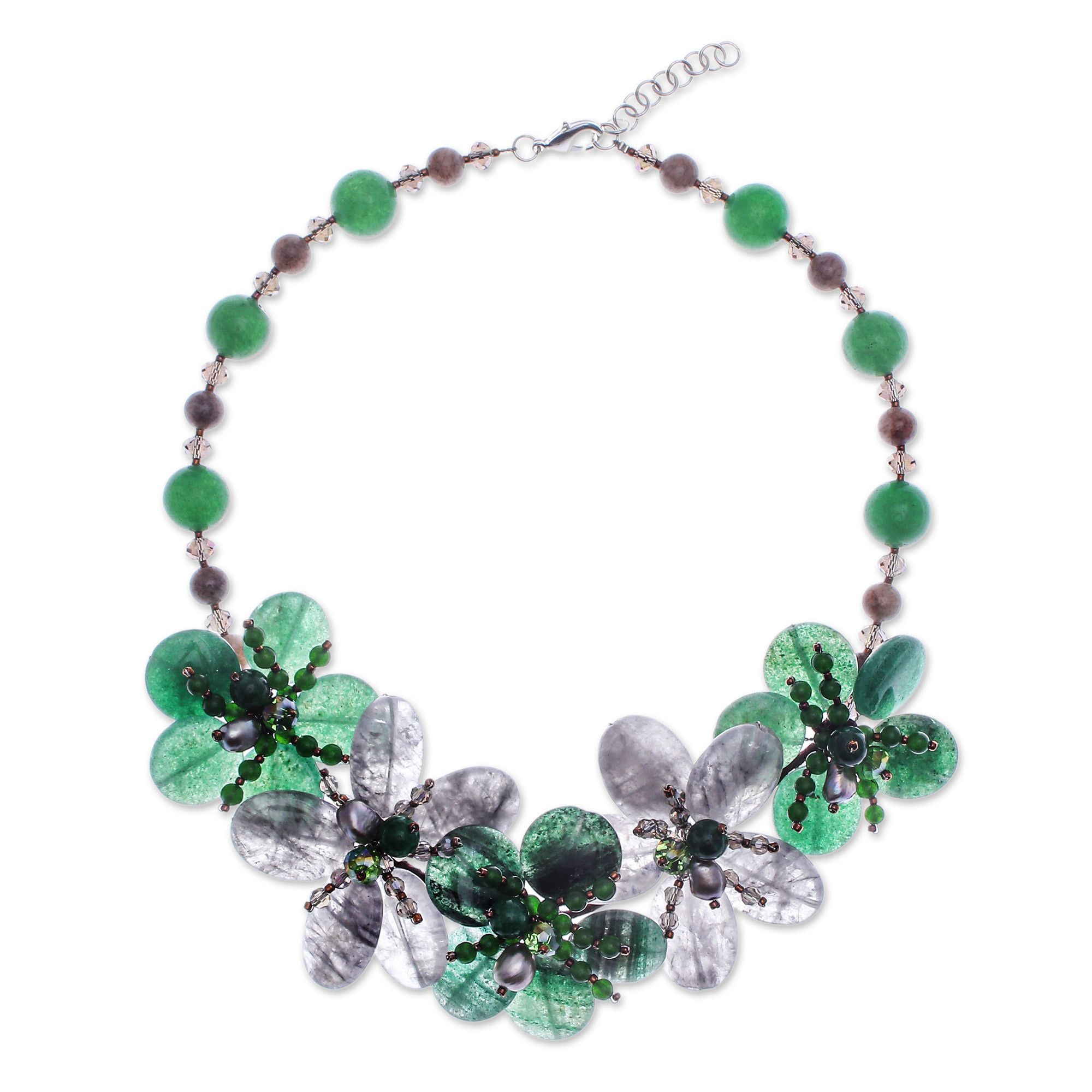 Following the maximalist style that characterizes her exquisite creations, Thai artisan Nareerat presents a stunning collection that combines flowers with the harmonious essence of Mother Nature. After long hours meticulously working with quartz, glass beads and cultured pearls in a grey hue, Nareerat creates this beaded statement necklace in a green palette, full of charm and sophistication. On top of that, the design—joined by stainless steel wires—features sterling silver-plated brass accents that allow for comfortable use.