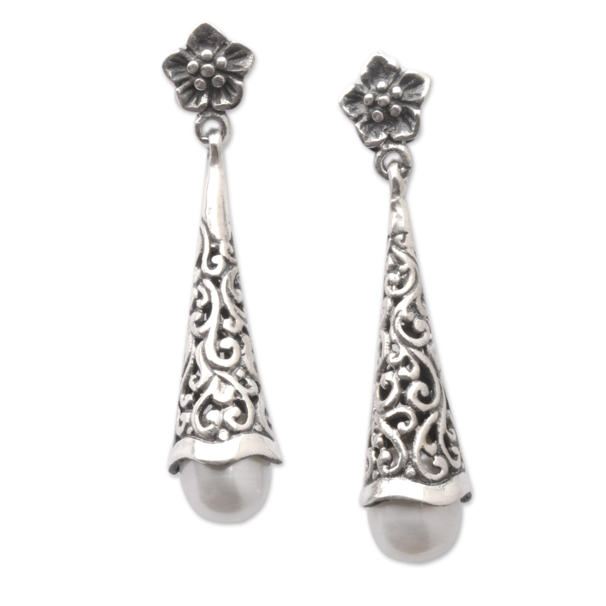Floral Sterling Silver Dangle Earrings with Grey Pearls, 'Floral Lantern'