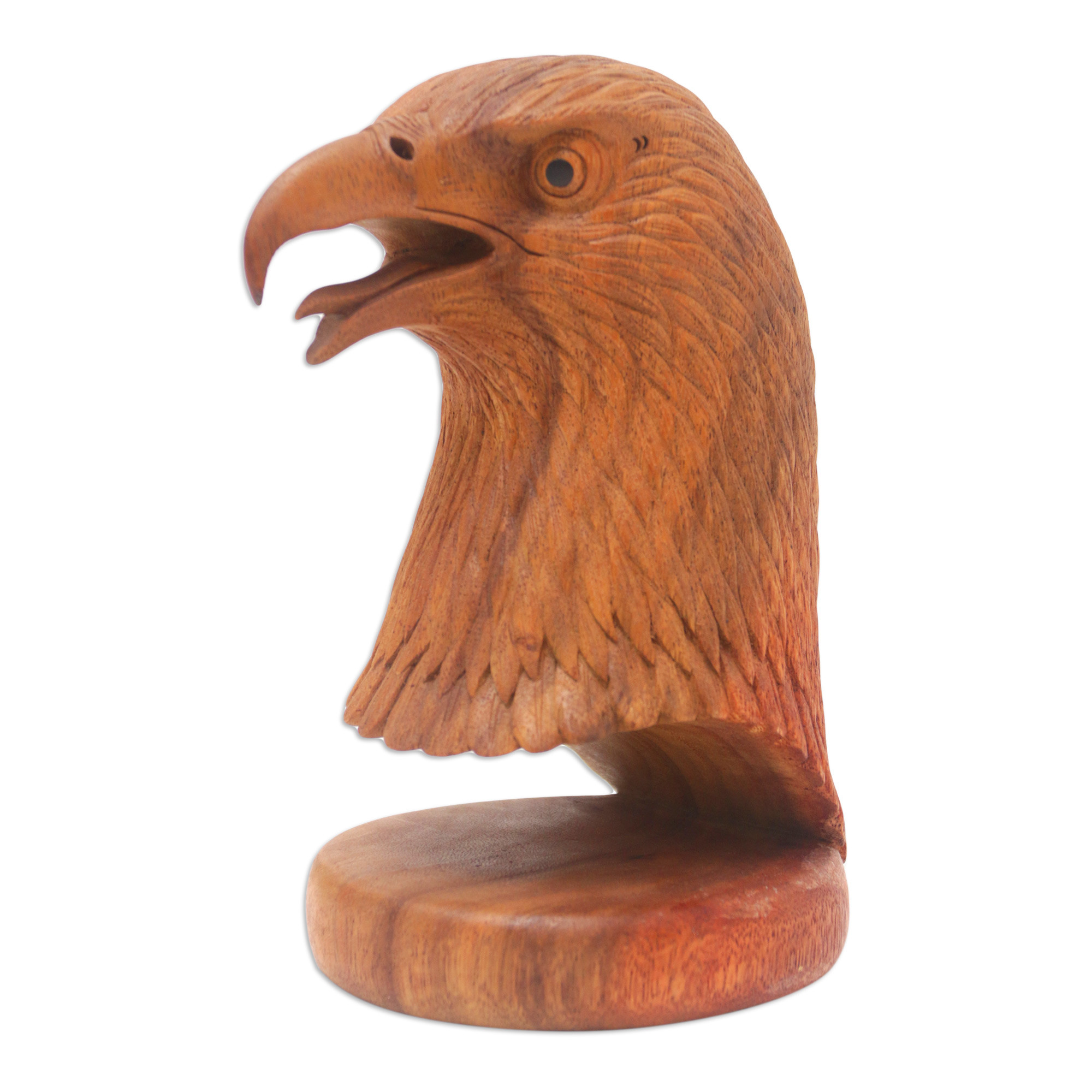 Hand-Carved Bird Sculpture in Balinese Suar Wood, 'Eagle's Gaze'