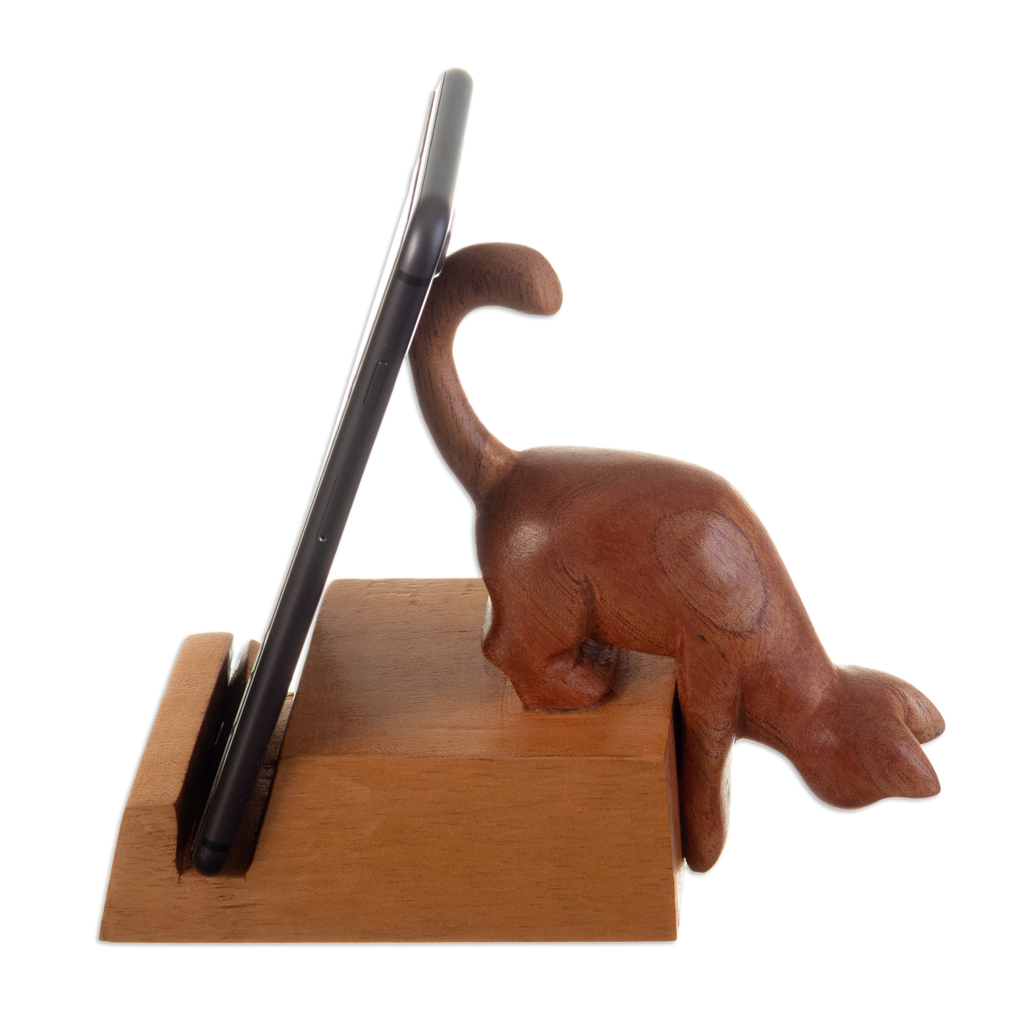 Hand-Carved Cat-Themed Brown Cedar Wood Phone Holder, 'Convenient Curiosity'