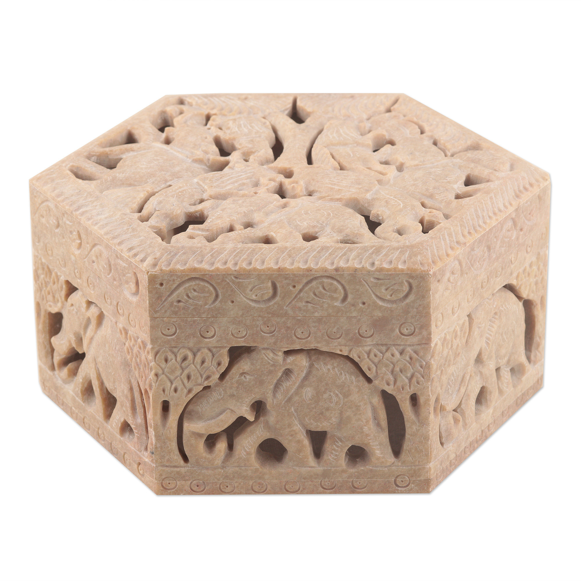 Handcrafted Animal Motif Soapstone Jewelry Box from India, 'Jungle Unity'