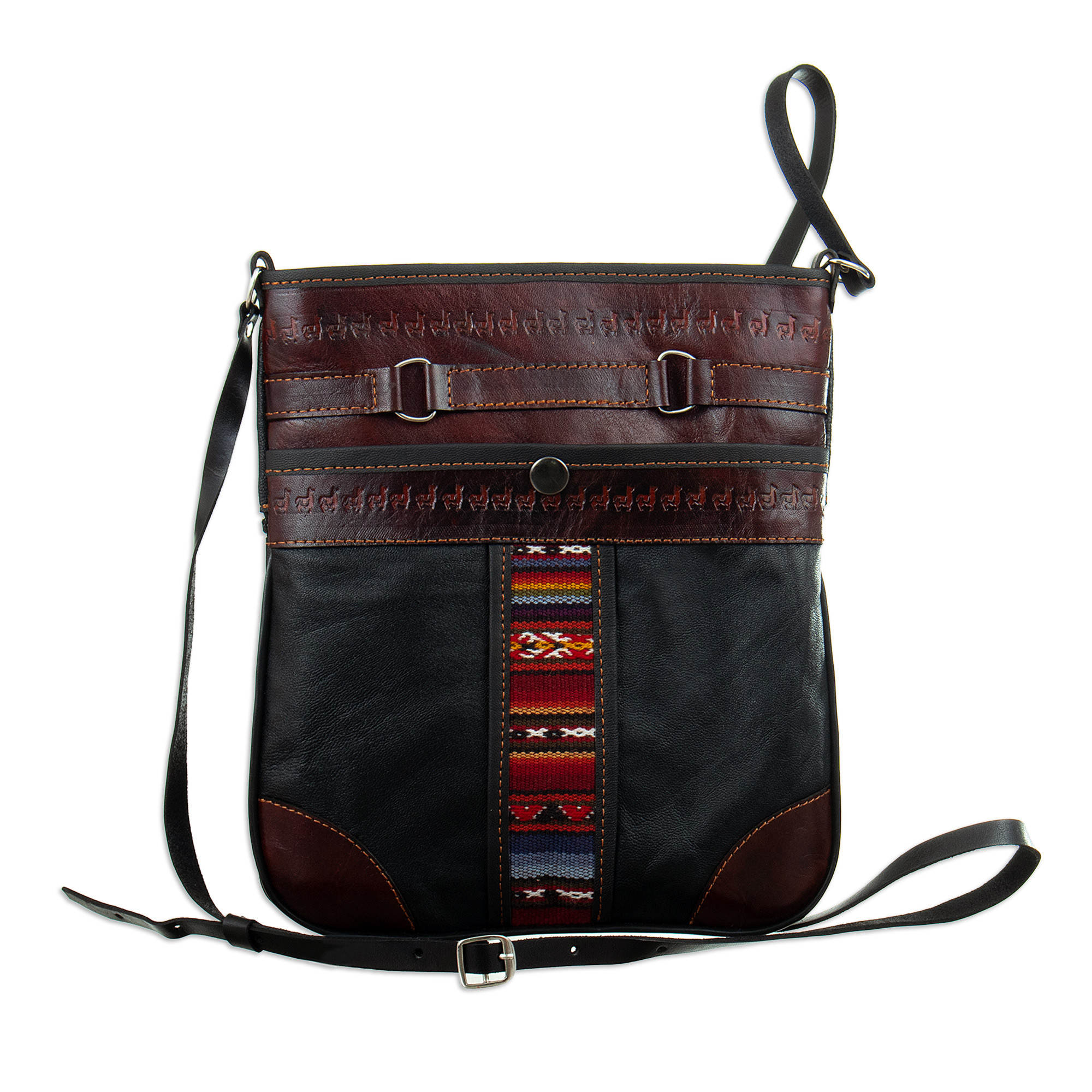 Handcrafted Brown and Black Leather Sling with Wool Accent, 'Andean Dame'