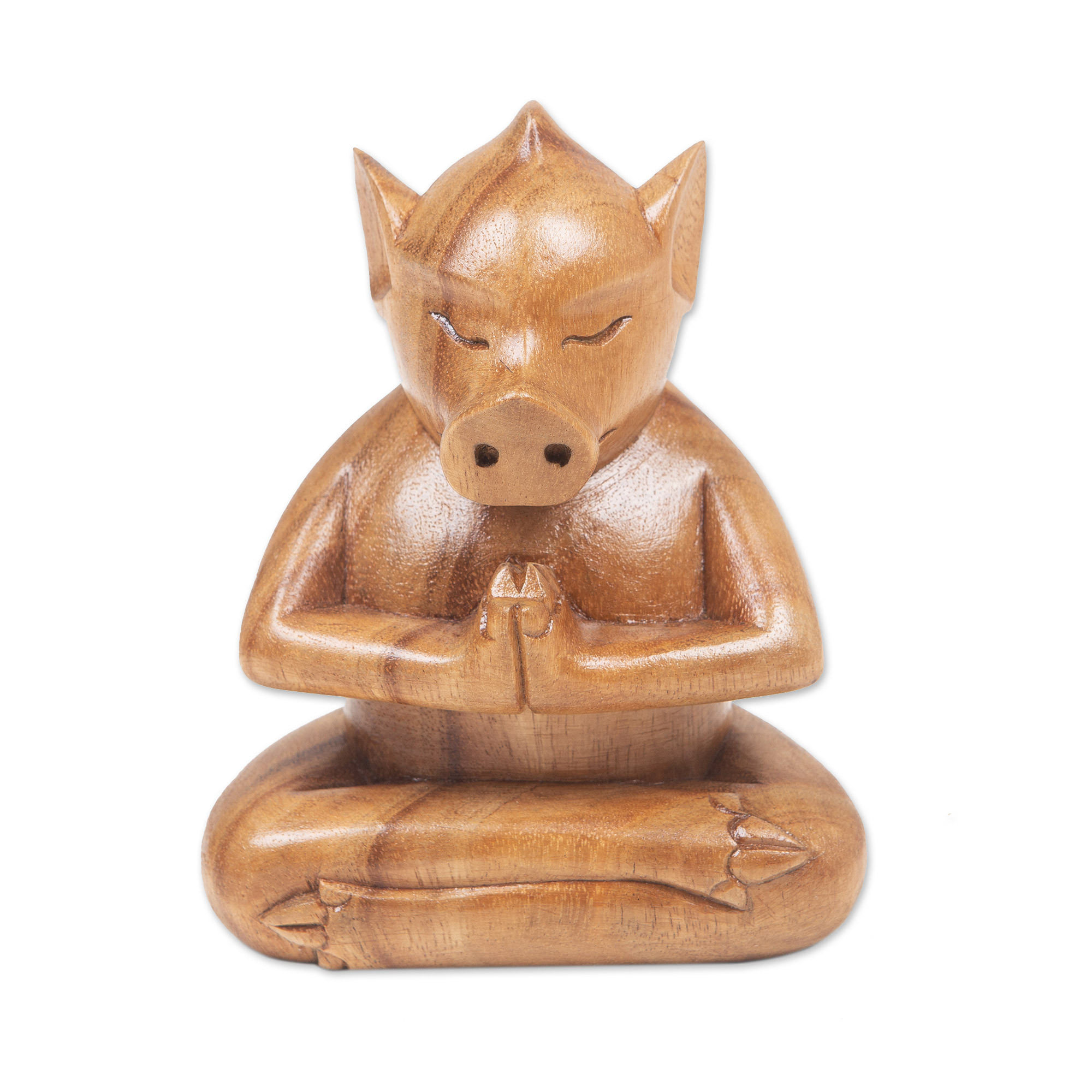 Handcrafted Brown Suar Wood Pig Statuette from Bali, 'Gentle Apprentice'