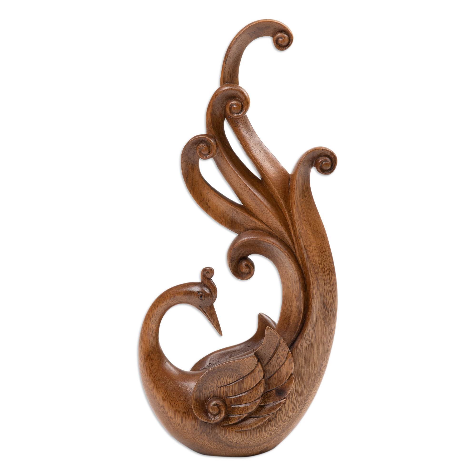 Heaven's glory arrives on Earth in the shape of an ethereal swan, whose feathers tell about the majesty of the sky realm. Crafted in Bali and presented by Eka, this suar wood sculpture is an exquisite piece of celestial elegance, enriched by a natural brown hue and grain pattern.