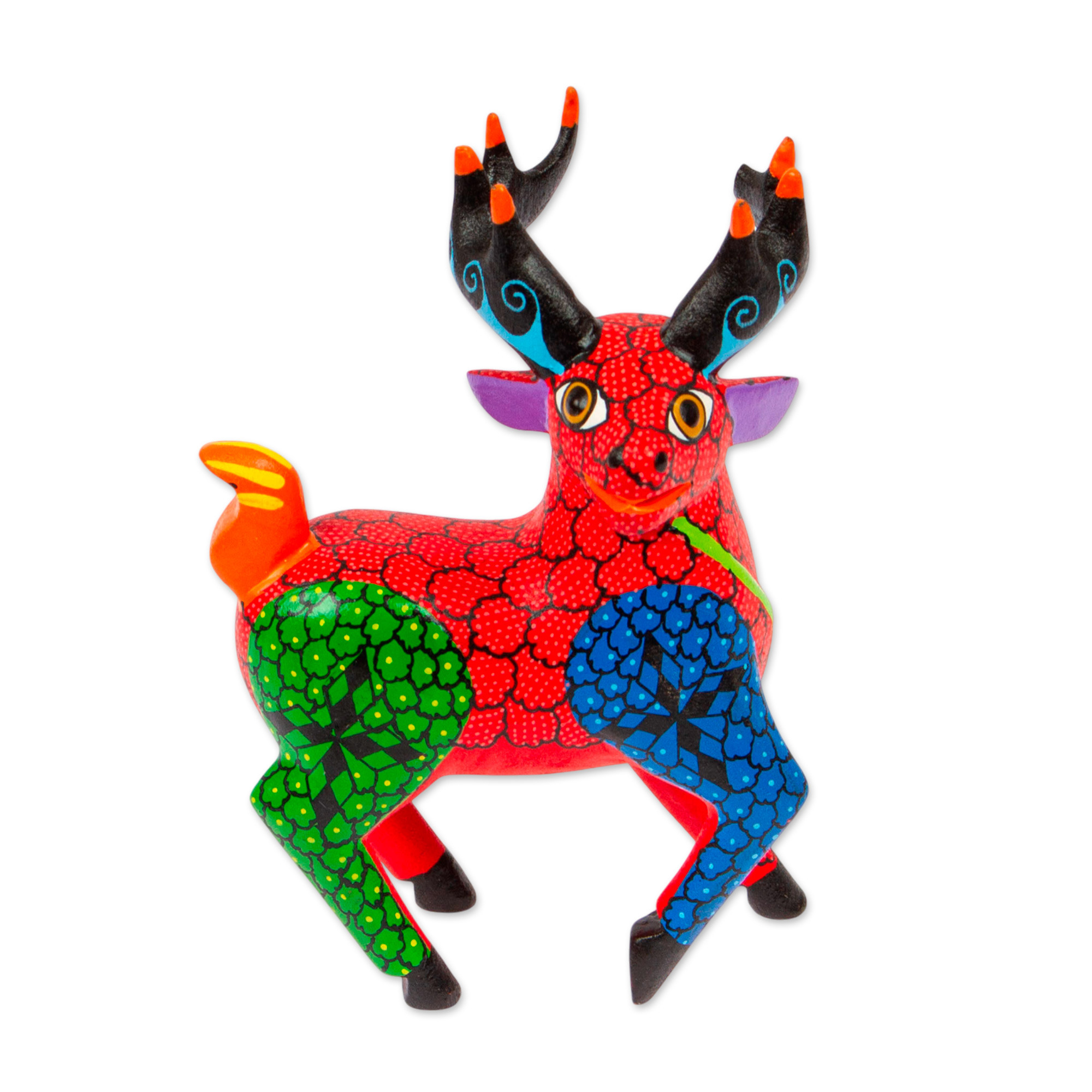 This brightly colored deer is the work of Mexican artisans Jesus and Roxana Hernandez, who preserve the distinctly Oaxacan folk art form of alebrijes. The figurine is carved by hand from copal wood before being carefully painted with a dizzying array of colorful motifs.