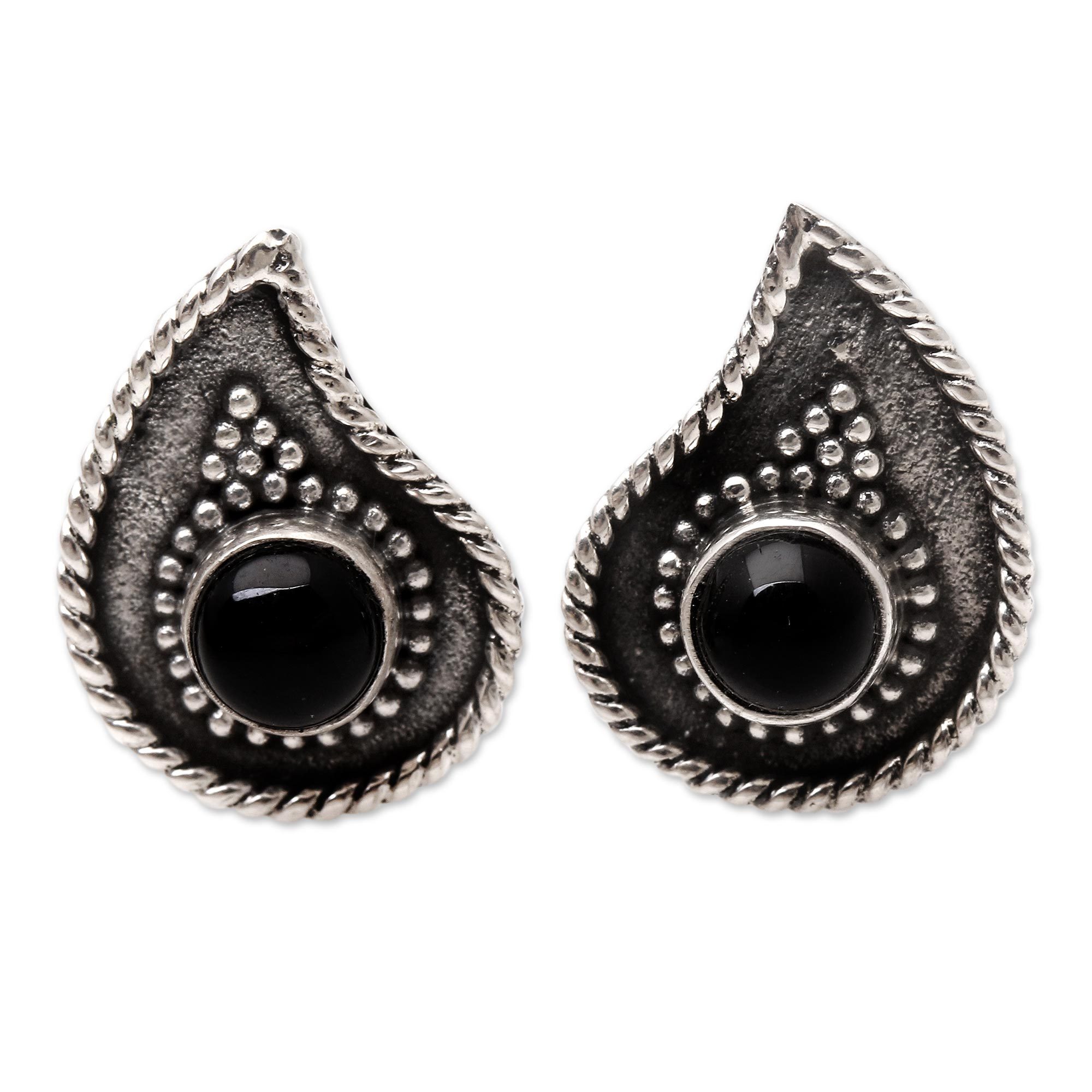 Handmade Onyx and Sterling Silver Button Earrings, 'Dark Teardrop'