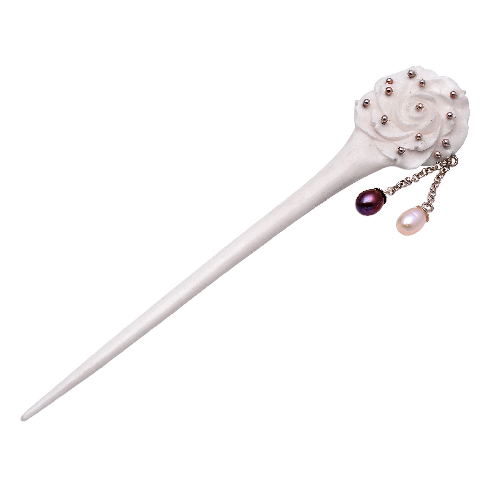 Rose Flower Bone and Cultured Pearl Hair Pin from Bali, 'Studded Rose'