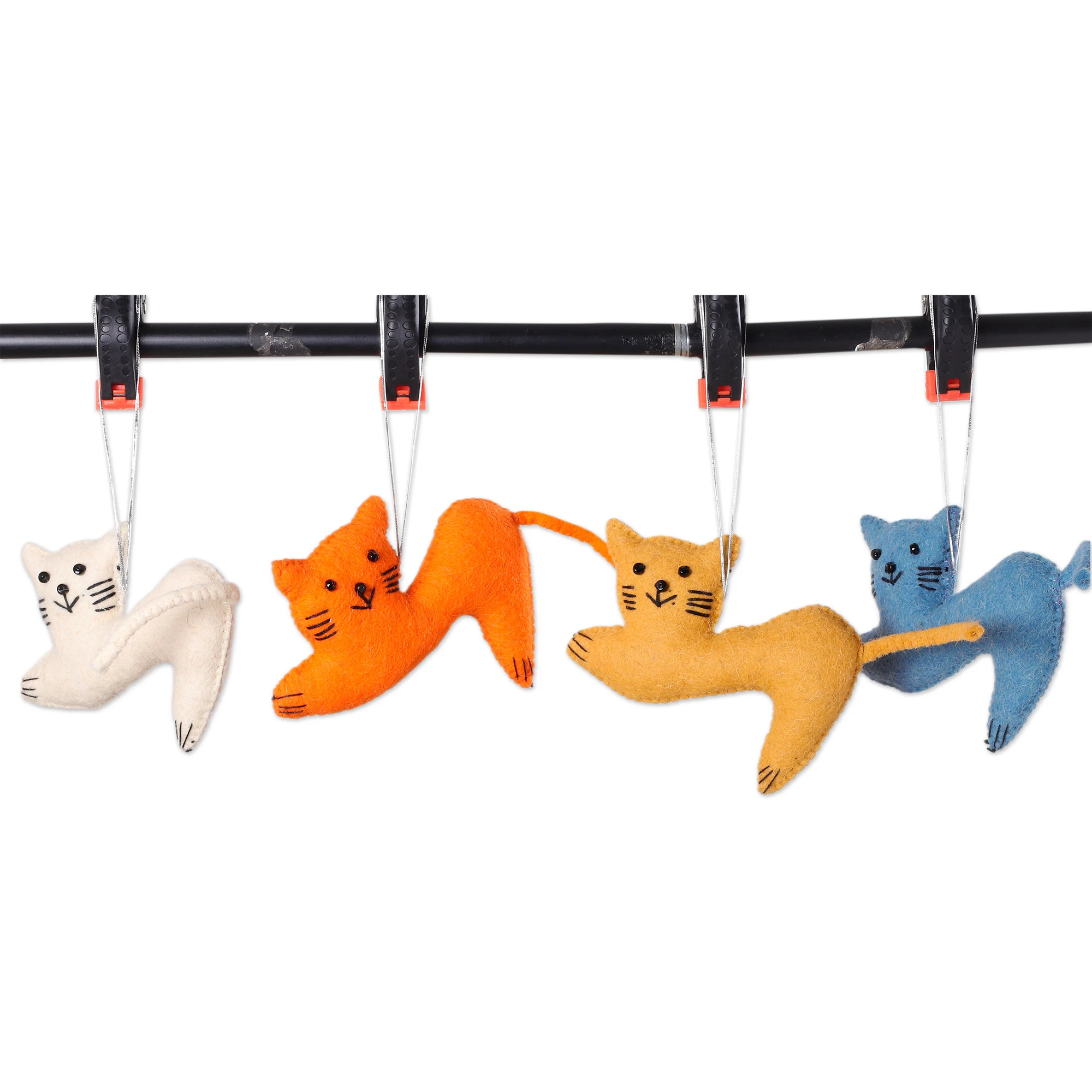 Set of 4 Handcrafted Cat-Shaped Wool Felt Ornaments, 'Festive Kittens'