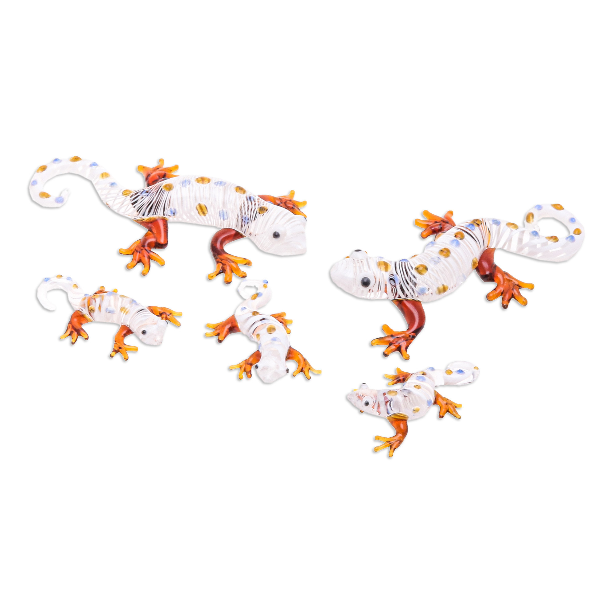 Set of 5 Handblown Glass Gecko Figurines in Warm Hues, 'Gecko Gathering'