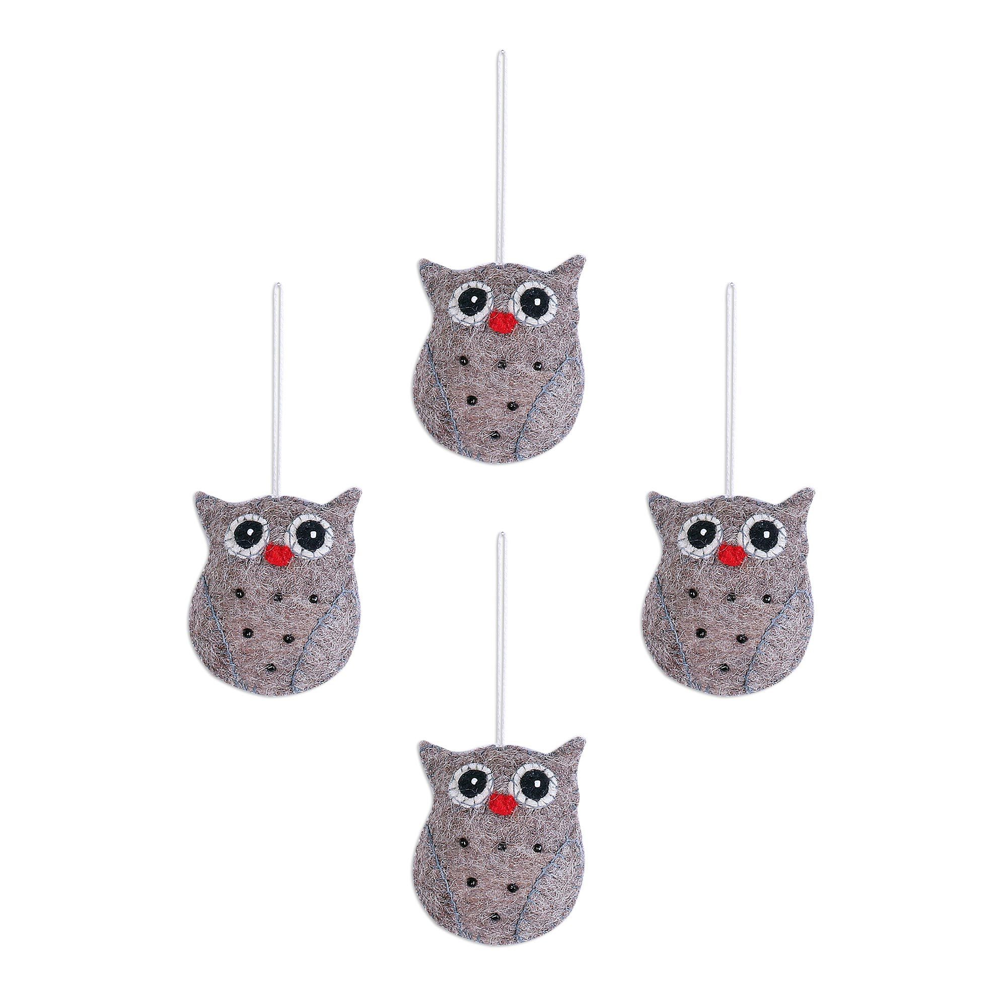 Set of Four Handcrafted Wool Owl Ornaments from India, 'Midnight Quartet'