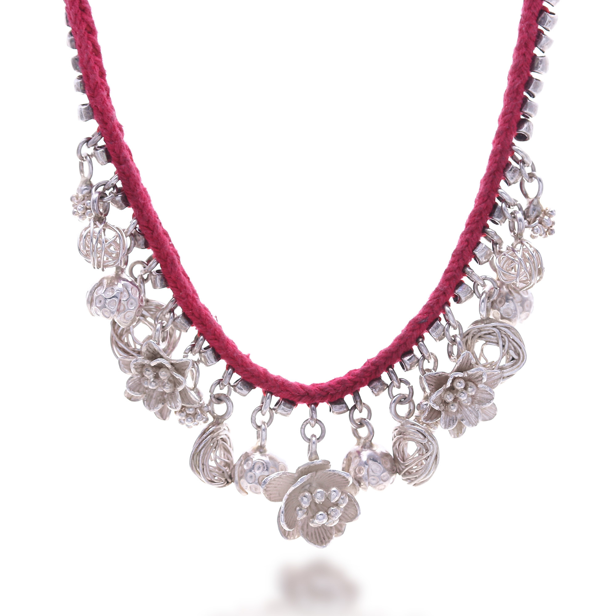 Silver Choker Charm Necklace with Red Cord from Thailand, 'Precious Shine'
