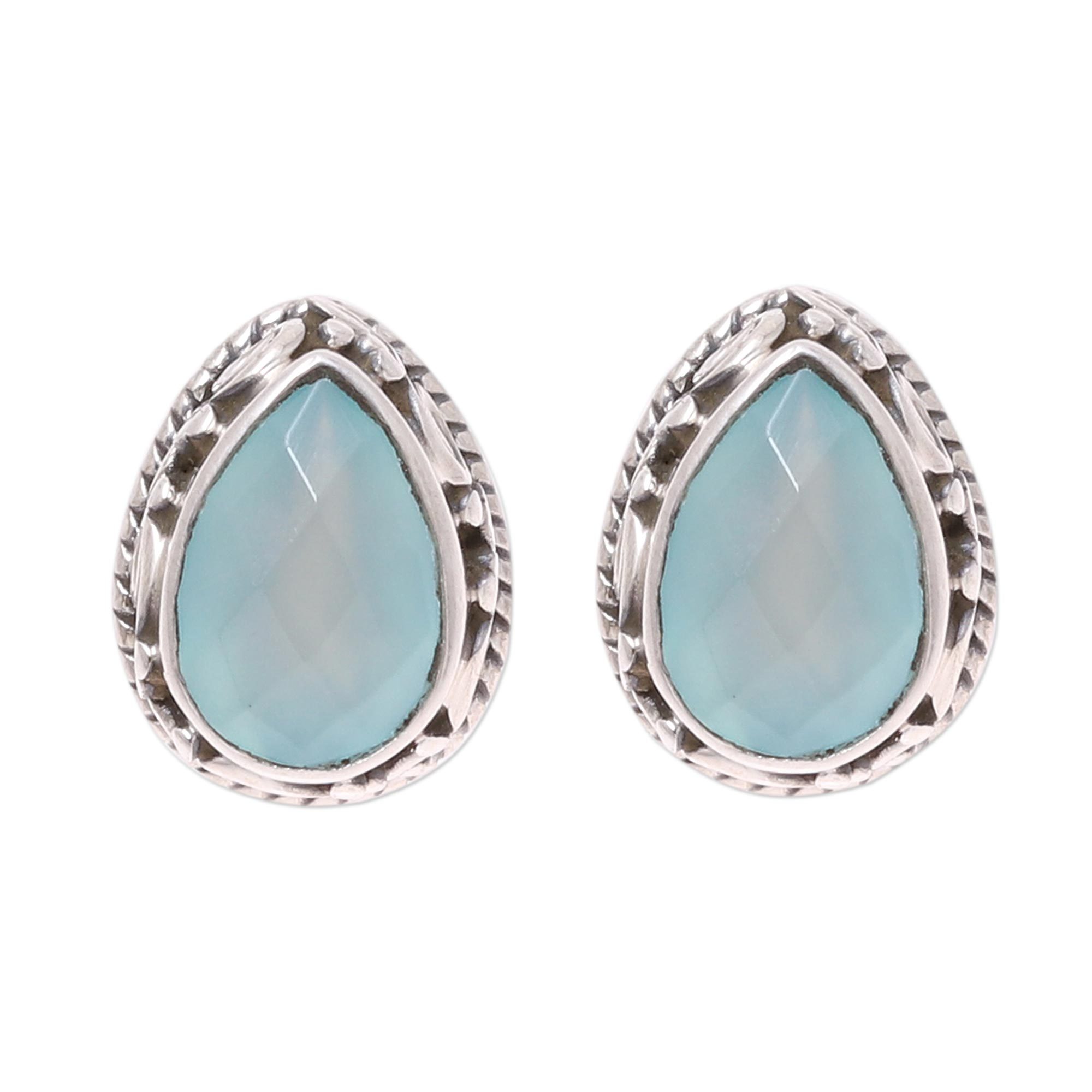 Sky Blue Chalcedony Teardrop Stud Earrings from India, 'Sky Mist'