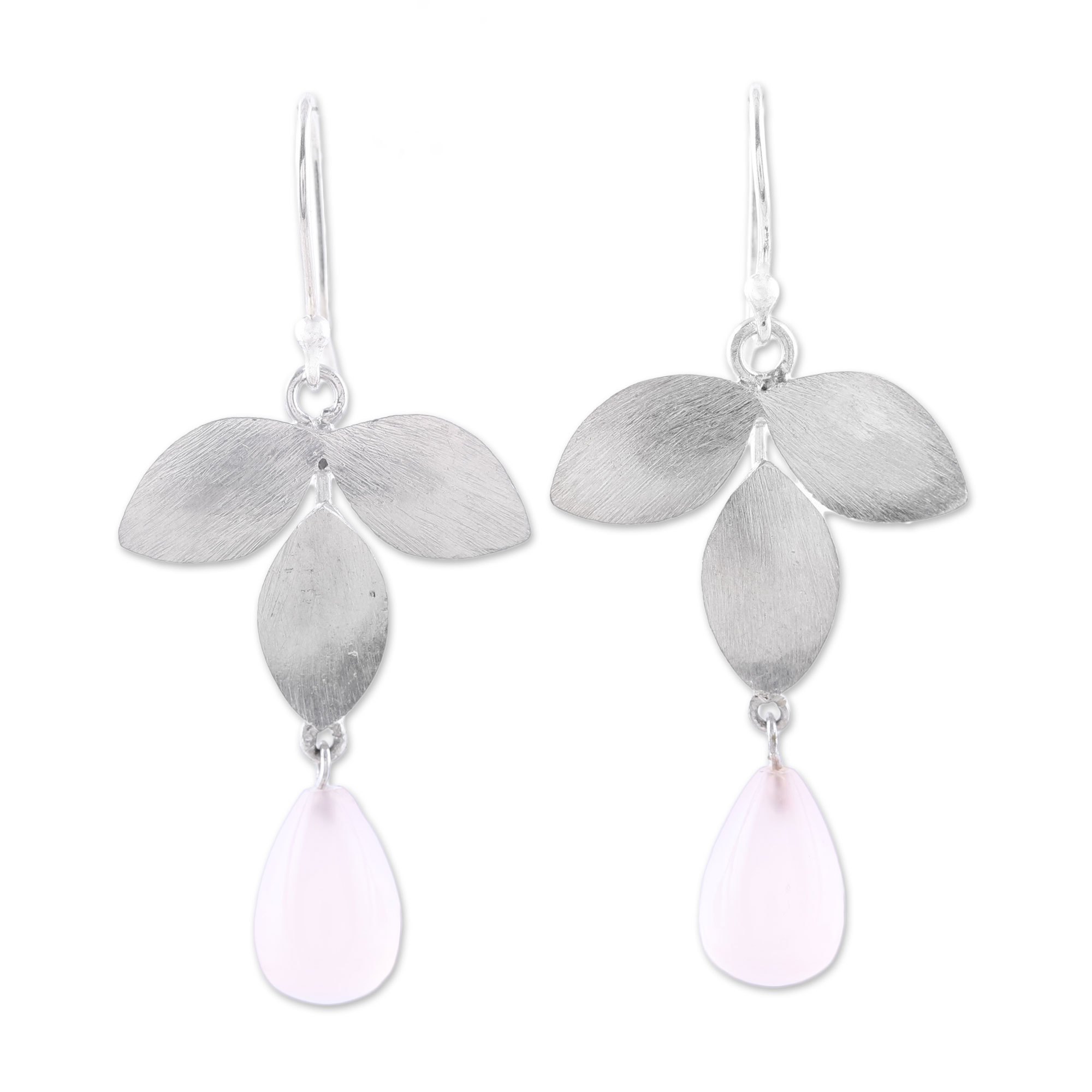Inspired by a misty morning among the forest trees, Alok Jain presents a beautiful pair of earrings. Textured sterling silver leaves host stunning pink chalcedony. The opaque composition of the gems add a feminine elegance to this pair.