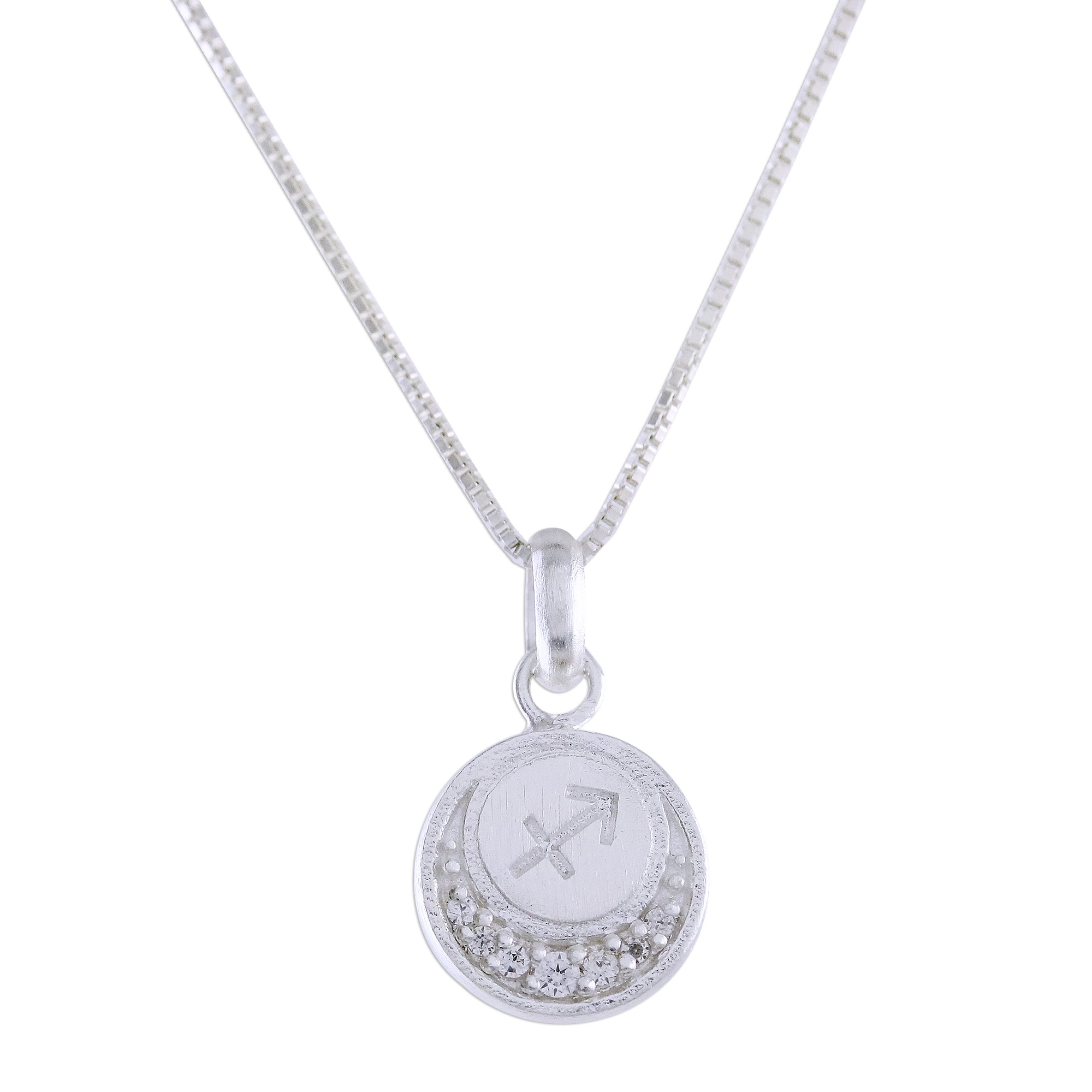The perfect accessory for you or the Sagittarius in your life, this sterling silver pendant necklace comes from Thailand's Sarote Lochotinunt. At the end of a box chain with a spring-ring clasp hangs a brushed-satin finish sterling silver pendant which is hand crafted using the lost wax technique. Within its round contours, the symbol for the zodiac sign Sagittarius (November 21 to December 21) is cradled by a crescent moon sprinkled with faceted cubic zirconia stones in a pave setting.
