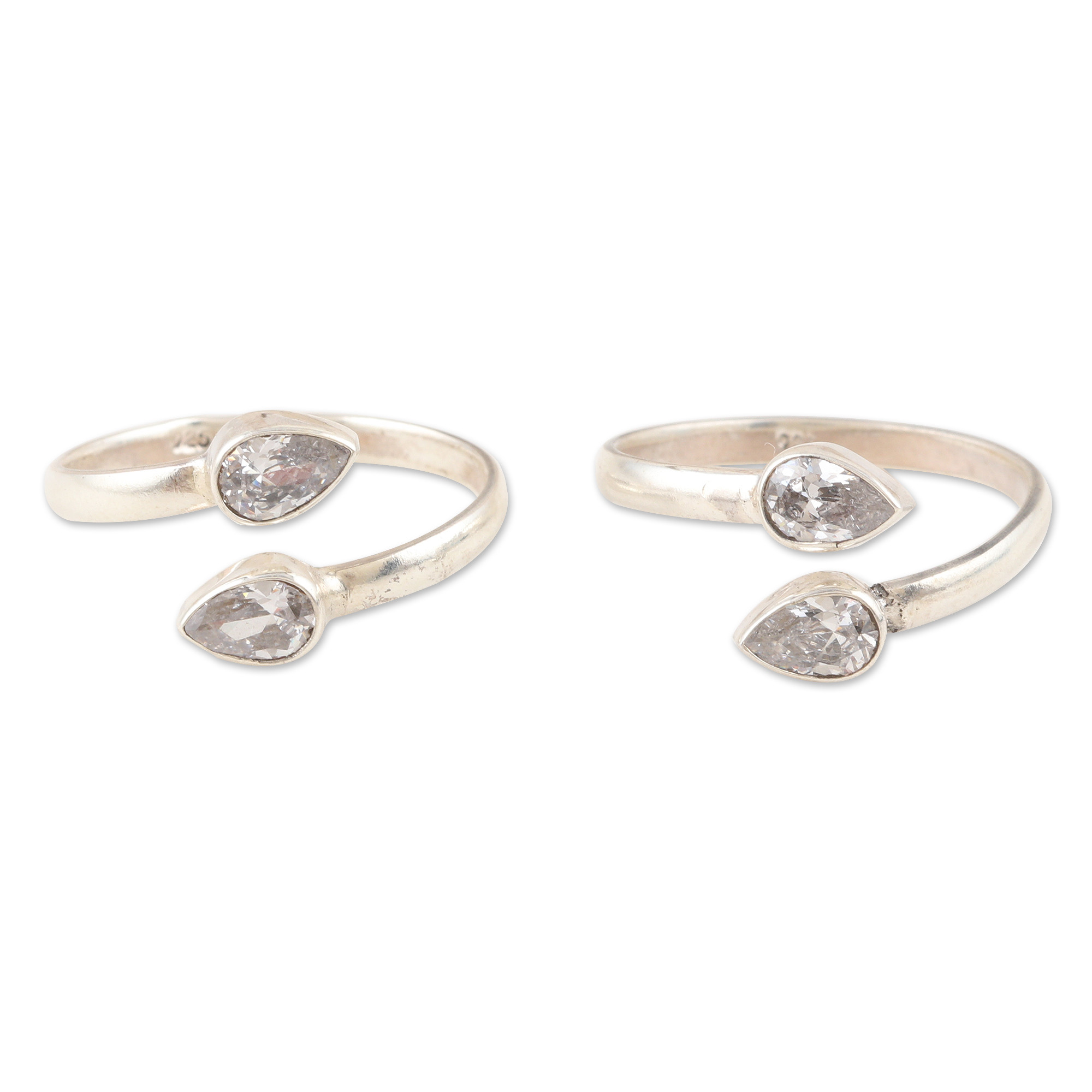 The exotic and shiny beauty of these sterling silver toe rings will fill your outfits with a refreshing aura, perfect for a youthful and vivacious style. Crafted by Indian artisans, Alok Jain's rings come with faceted pear-shaped cubic zirconia stones totaling two carats, all enhanced by a high-polish finish.