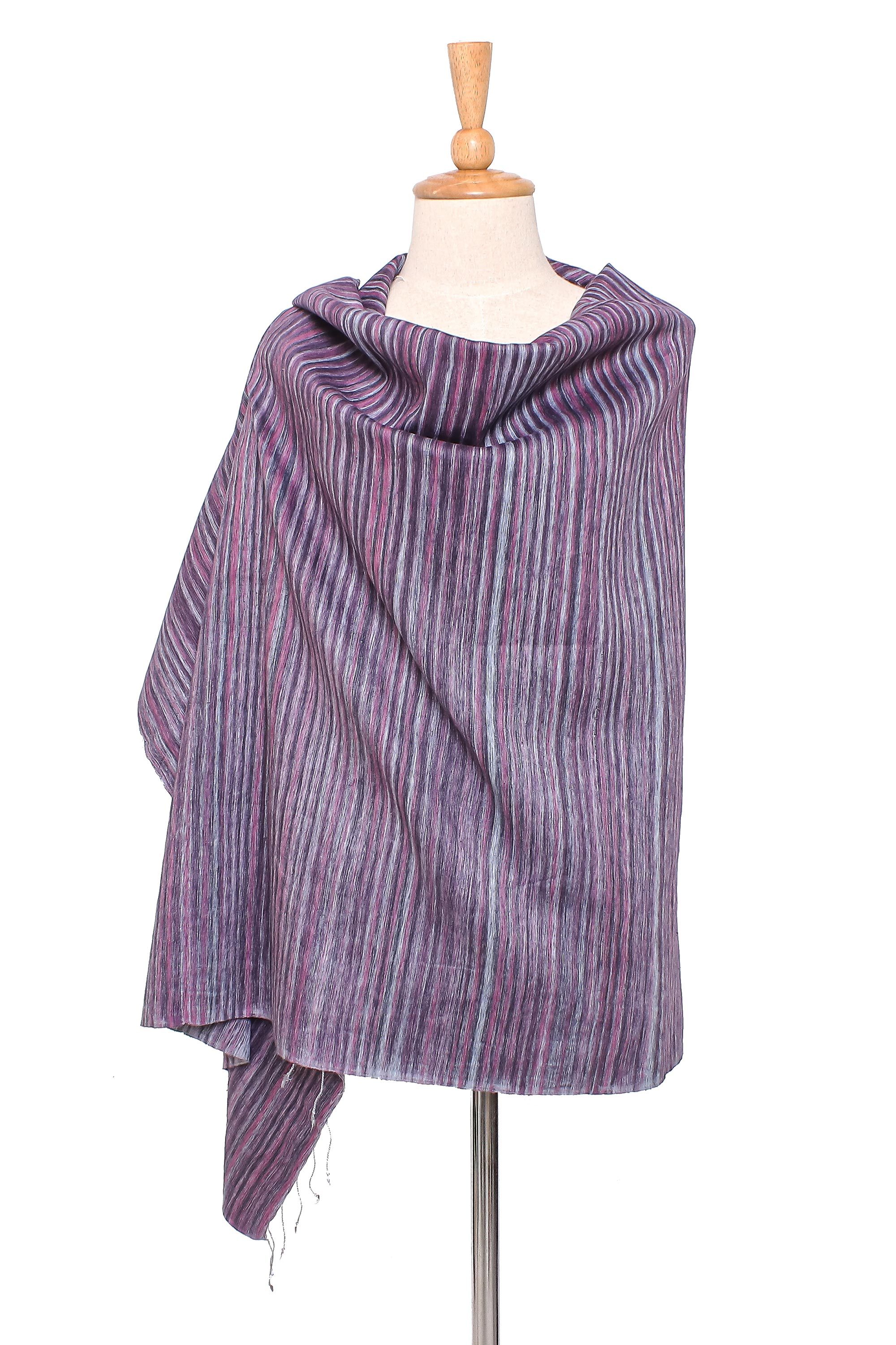 Featuring multicolored stripes with a predominant pink hue, this shawl from Thailand is designed by Vinita. She works with local artisans to weave this accessory by hand from a silk and cotton blend. Elegant fringes complete the shawl at the ends.