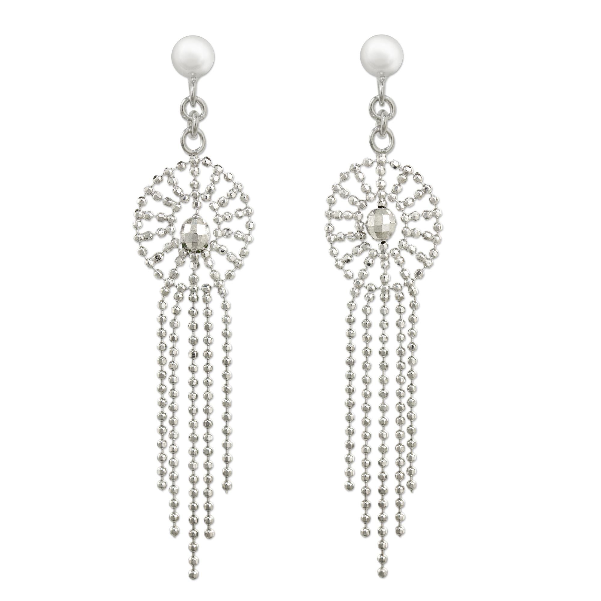Thai Chandelier Earrings Handcrafted in Polished 925 Silver, 'Moonbeam Cascade'