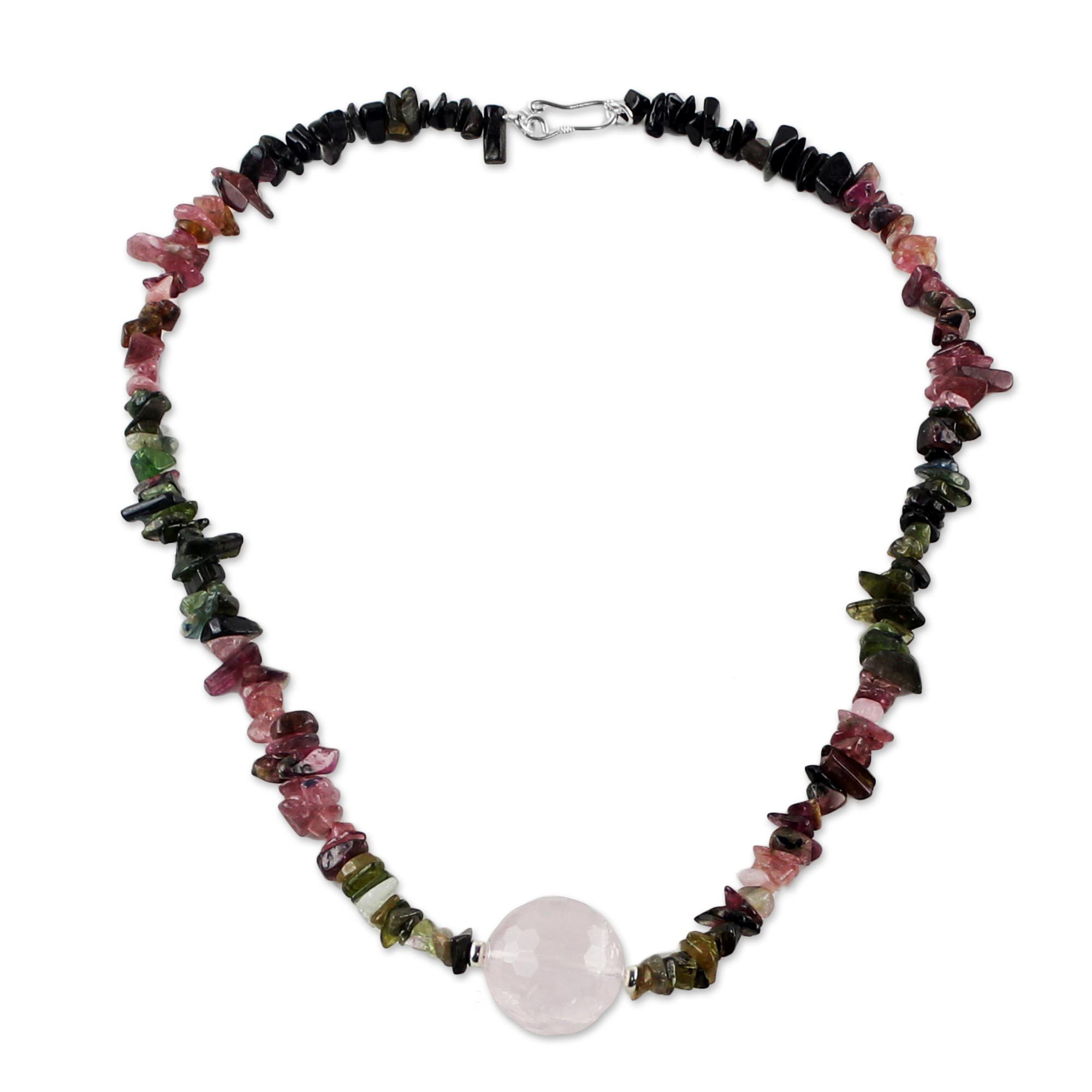 Thai Rose Quartz and Tourmaline Beaded Pendant Necklace, 'Natural Rose'