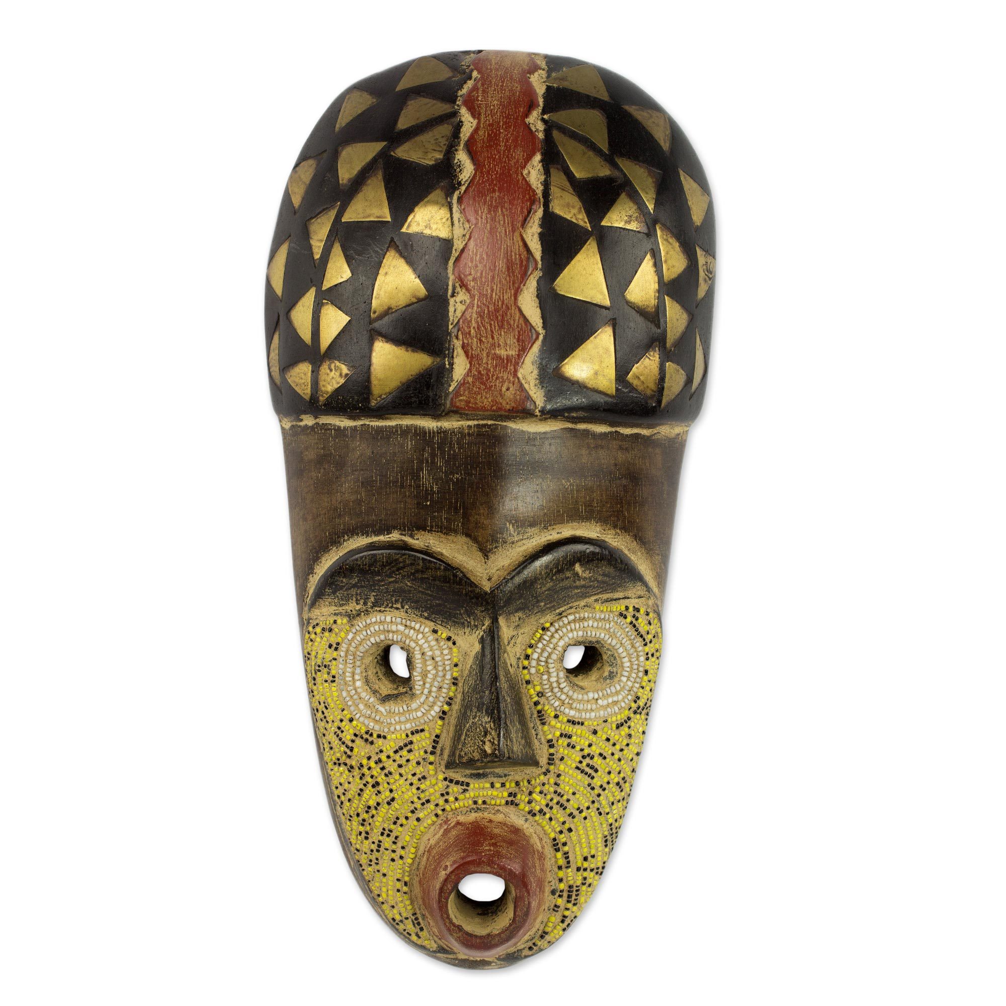 Painted by hand with black and red motifs and accented with triangular brass shapes, this African mask is hand-carved from local sese wood by Ghanaian artisan Awudu Saaed, featuring an original design. The face of the mask is adorned with recycled glass beads in beige, yellow, and black, named Sorko, a word meaning "fisherman" in the language of the Zarma people of Niger.