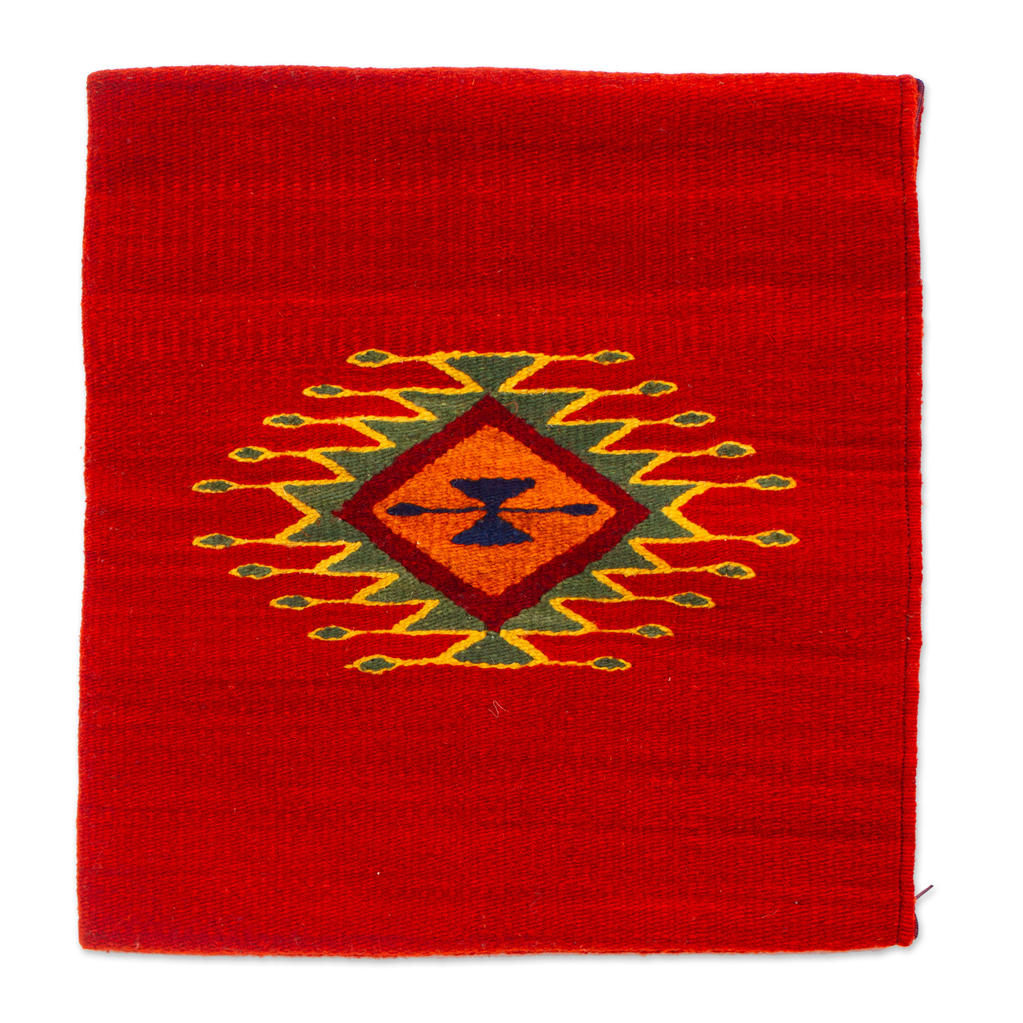 Zapotec Red Wool Cushion Cover Woven by Hand in Mexico, 'Vibrant Eye of God'